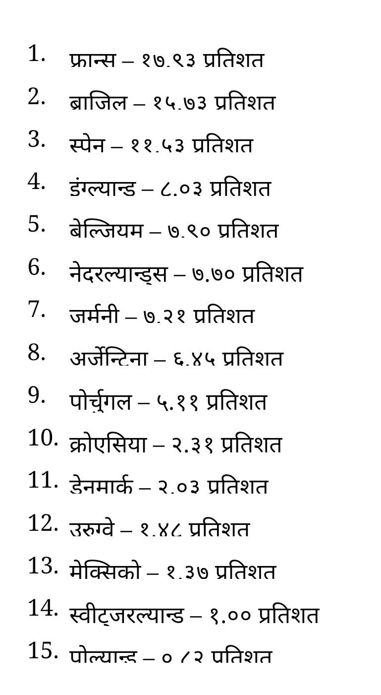 तर, पछिल्लो सर्वे रिपोर्टमा भने धेरैले फ्रान्सलाई नै विश्वकपको नम्बर १ दाबेदार मानेका छन् । फ्रान्सलाई मेस्सीको अर्जेन्टिना र रोनाल्डोको पोर्चुगललाई भन्दा पनि बलियो दाबेदार मानिएको छ । फ्रान्स पहिलो स्थानमा रहँदा दोस्रो स्थानमा ब्राजिल रहेको छ । ब्राजिलले विश्वकप जित्न सक्छ भन्नेमा १५.७३ प्रतिशतले मत दिएका छन् ।