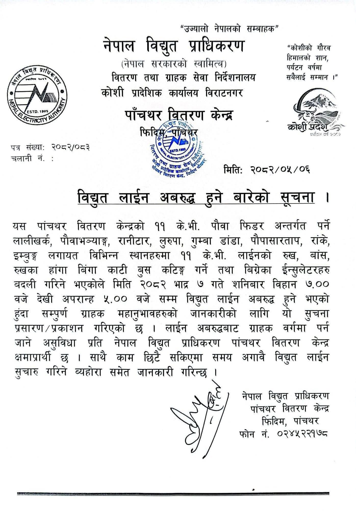 वितरण केन्द्रका अनुसार ११ के.भी. पौवा फिडरअन्तर्गत पर्ने लालिखर्क, पौवाभञ्ज्याङ, रानिटार, लुङरुपा, गुम्बाडाँडा, पौवारासारताप, रांके, इम्बुङलगायतका क्षेत्रमा सो अवधिभर विद्युत् आपूर्ति रोकिँदै छ।