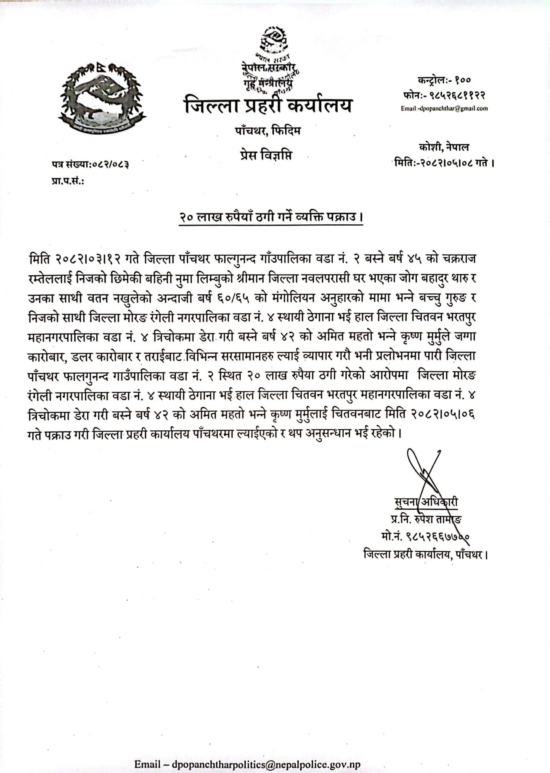 पाँचथर।जिल्ला प्रहरी कार्यालय पाँचथरले २० लाख रुपैयाँ ठगी गरेको आरोपमा एक व्यक्तिलाई पक्राउ गरेको छ।