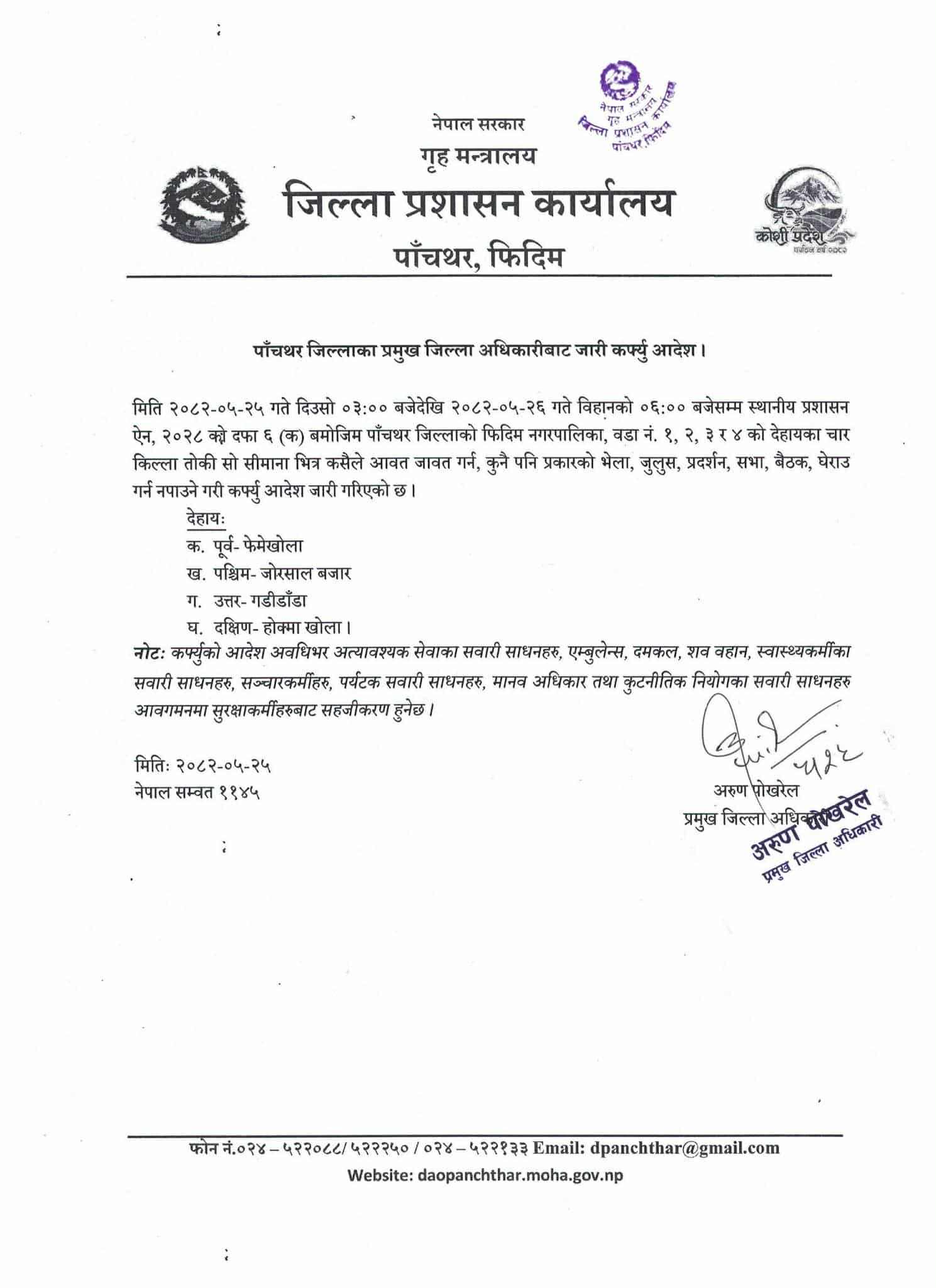 पाँचथर । पाँचथर जिल्ला प्रशासन कार्यालयले फिदिम नगरपालिकाको तोकिएको क्षेत्रमा बुधबार दिउँसो ३ बजेदेखि बिहीबार बिहान ६ बजेसम्म कर्फ्यु जारी गरेको छ।