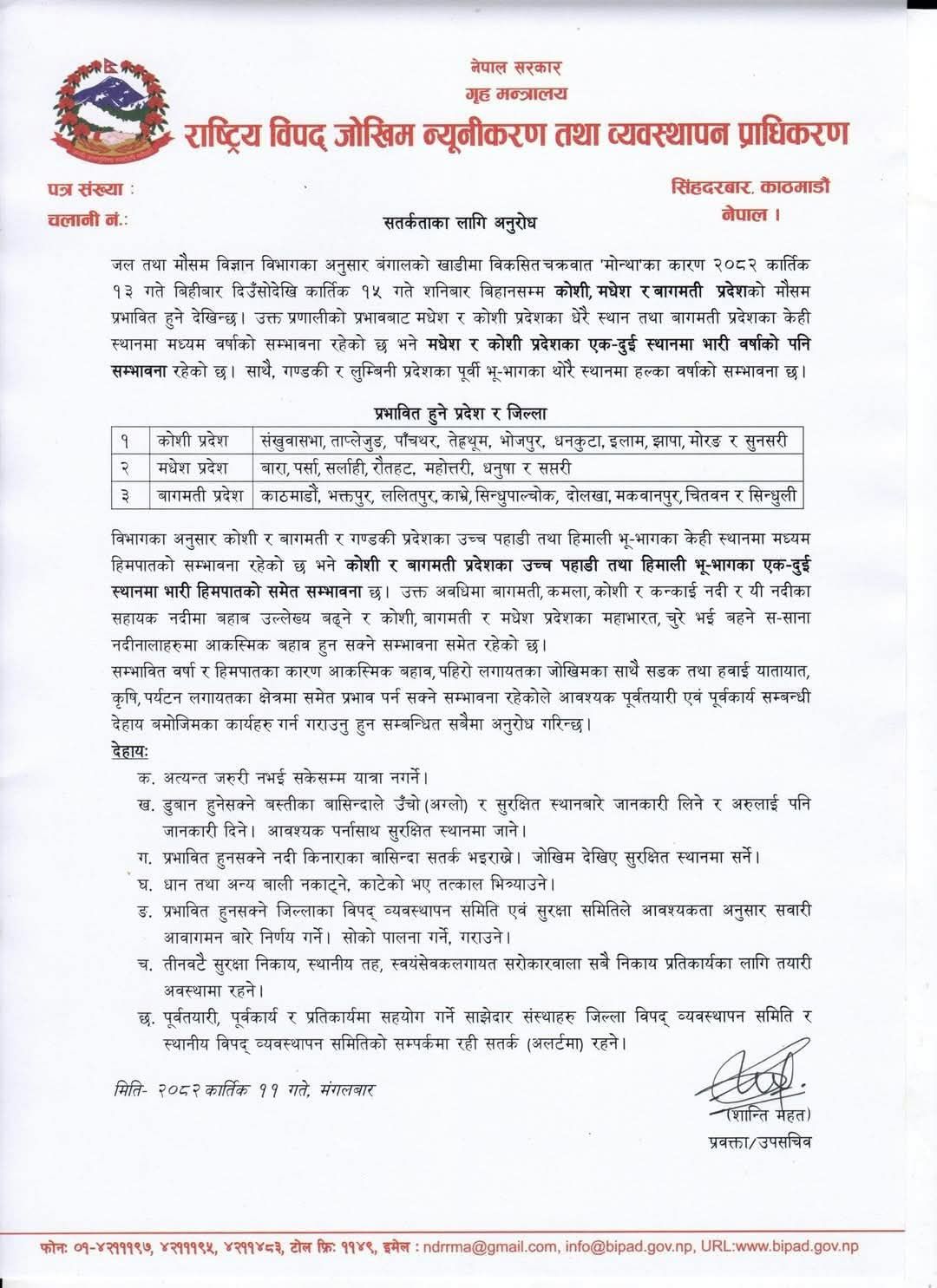 ‘जल तथा मौसम विज्ञान विभागका अनुसार बंगालको खाडीमा विकसित चक्रवात ‘मोन्था’ का कारण २०८२ कात्तिक १३ गते बिहीबार दिउँसोदेखि कात्तिक १५ गते शनिबार बिहानसम्म कोशी, मधेस र बागमती प्रदेशको मौसम प्रभावित हुने देखिन्छ। उक्त प्रणालीको प्रभावबाट मधेस र कोशी प्रदेशका धेरै स्थान तथा बागमती प्रदेशका केही स्थानमा मध्यम वर्षाको सम्भावना रहेको छ भने मधेस र कोशी प्रदेशका एक–दुई स्थानमा भारी वर्षाको पनि सम्भावना रहेको छ। साथै, गण्डकी र लुम्बिनी प्रदेशका पूर्वी भू–भागका थोरै स्थानमा हल्का वर्षाको सम्भावना छ,’ प्राधिकरणले भनेको छ।